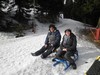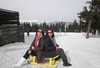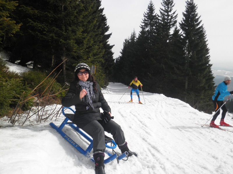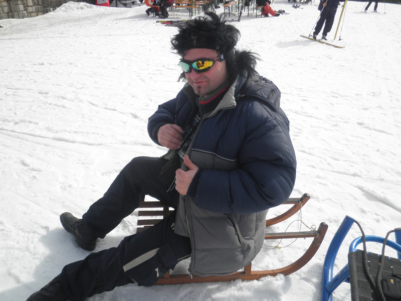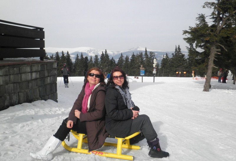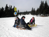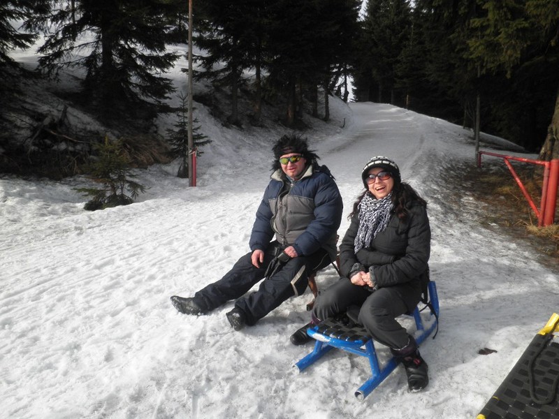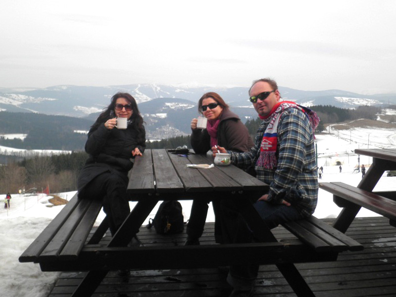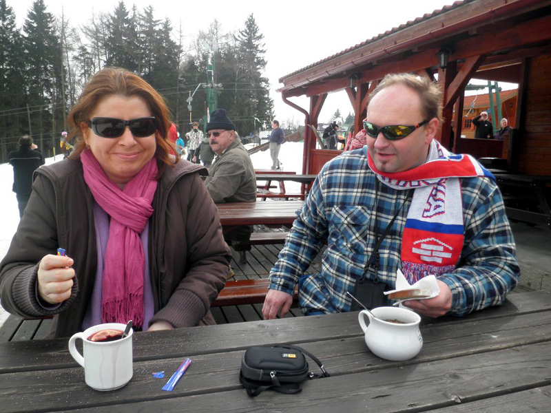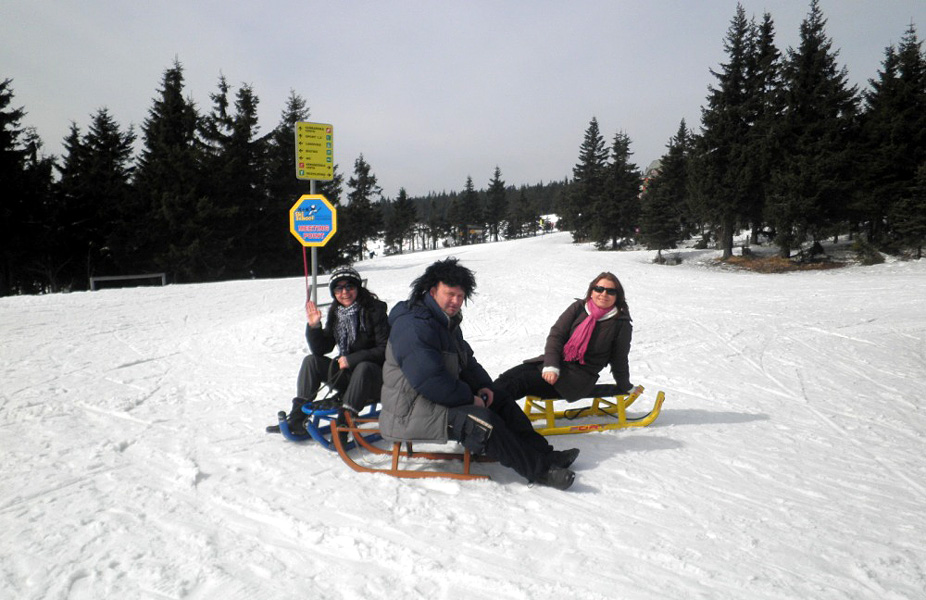 Na další výlet do Zemanova království jsme se domlouvali už během Vánoc s tím, že hlavní bod programu budou zimní radovánky na sněhu - konkrétně úžasná sáňkařská dráha na Černé hoře v Janských lázních. Bohužel už na posledním ratata v Lenčině novém příbytku bylo jasné, že tentokrát nebude účast vysoká. U Lenky budou štěňata a Tomášovi zlobí krční páteř. Takže se jede ve třech, Jára veze Mirku s Magdou z Prahy rovnou do Janských. Už shora vidíme přeplněné parkoviště a lanovka "Černohorský expres" se činí. Jára má své sáňky samochodky, holky jdou do půjčovny. Tam jsme varováni, že na trase jsou ledovky a velmi velmi rychlá jízda je nebezpečná. Slíbíme, že dáme pozor a budeme brzdit co to dá! Počasí jsme si nemohli přát lepší. Járova "Drupi" hříva vlaje a vlasy mu vstávají hrůzou na hlavě! Na obídek jsme došli-dosáňkovali do hotelu Černá bouda s vyhlídkou na Sněžku. Druhá jízda už vede místy loužemi rozbředlého sněhu, ale zábava je to ohromná. Kolem 16hod. opouštíme lázně. Pan Zeman se vůbec nezměnil, jak to dělá že nestárne?! Krátce projdeme okolí domu, fotíme při západu slunce. Večer si prohlížíme fotky na Járově notebooku a povídáme o životě. Nevídáno - Jára ani moc neblikal, výzdoba je decentní, jeden svítící delfín s rybičkou, soba a sáně nechal v autě. Horský vzduch nás uspal docela brzo. Neděli trávíme okukováním lyžujících ve Ski areálu Šachty a máme sto chutí si to zkusit - ani jeden z nás nelyžuje, ale je to lákavé. Vymýšlíme jak se vozit se sáňkama na vleku a plánujeme výlet na příští zimu, chceme vyzkoušet i snowtubing, ten už je teď zavřený. Na oběd si zajedeme do známé hospůdky na Perlíčku zvané Prdek, tam obdivujeme panoramata a pomalu se chystáme na cestu zpátky. Tu Jára pojal vyhlídkově a nejrůznějšíma "nábližkama" jedeme přes Kokořínsko, chráněnou oblast vodního zdroje zv. Klokočka, atd. V Praze jsme asi o hodinu později než obvykle, ale všichni v dobré náladě :).(TK)