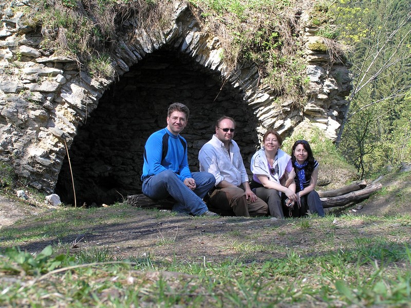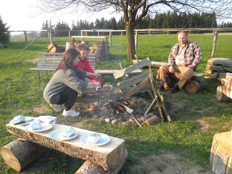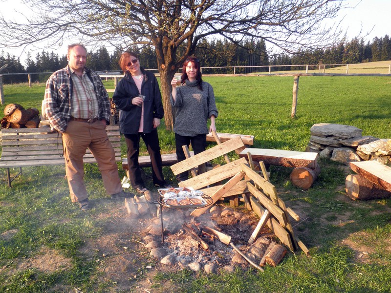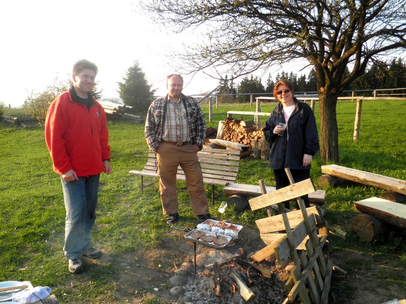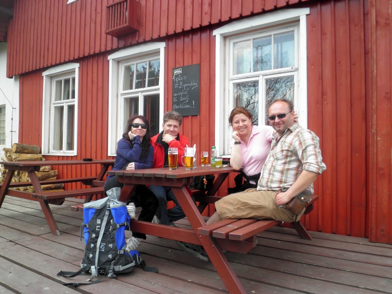 Vyjíždíme v sobotu za slibného počasí Járovou „žabičkou“ ve čtyřech: Jára, Tom a M+M. Nespěcháme, po obědě nás pan Zeman ubytuje a už vyrážíme na "malou" obhlídku okolí. Jdeme lesem, kolem Mexika, přes Tomášův kříž až na Prdek. Je krásně, předjaří v Podkrkonoší je nádherné. Cestou zpátky stavíme v Mexiku na "jedno" a již tradiční fotky v kruhovém okénku. Cestu lesem zpět si musíme zafixovat do paměti, ale ne do té vizuální - to by nám bylo v noci stejně na p-r-d. Večeři jsme si vlastnoručně upekli u ohně na grilu - to jsme tu ještě nezažili! Nejen že nám chutnala, byl to navíc krásný večer a všichni přispěli svým dílem k jejímu zdaru (také dík p.Zemanovi za aluminiové tácky) Nechyběly ani písně božského Káji! Setmělo se, hrajeme zmatek už skoro jako ostřílení zmatkáři. Po krátkém hecování vyrážíme na noční akci. Je nebo není to bojovka? To kdybychom věděly! Napětí visí ve vzduchu, kdy zhasnou ty baterky a odkud na nás cosi vyskočí? V duchu mírného podezřívání našich spolužáků T+J projedeme celý les i cestu zpět, ale oni jsou stále vzorní hoši :-) Jestli něco měli za lubem - to už se asi nedozvíme... Nedělní počasí je ještě hezčí než včera. Tom určil azimuty, po červené až k zřícenině Navarov, pak podle řeky Kamenice. Nádherná trasa. V Bozkově navštívíme dolomitové jeskyně, krátká zastávka na dočerpání tekutin a po modré zpátky do Vysokého. Raději už ani nezastavujeme..Jára jde celou dobu v "bačkůrkách" :-) V hospodě na náměstí dáme véču, chystá se tam legentární kapela "Fous" hrát k tanci a k zábavě. Kdo by si myslel, že doma padneme únavou a vyčerpáním, je na omylu. Ještě nás čeká ping-pong, čača, jive, country a polka! Jenom na tango nedošlo (tak snad příště). O velikonočním pondělí se kluci chopili pomlázky a dali nám na zadek (jemně). Ráno se počasí trochu pokazilo a naše lýtkové svaly mírně protestují proti vzpřímené chůzi. Nevadí, jdeme hledat cestu na rozhlednu, kterou jsme včera viděli na obzoru z polní cesty za Vysokým. Vypadá, že je docela blízko, tak se držíme azimutu rovnou za nosem. Klesáme a stoupáme několikrát, polem nepolem, pod smrkem přečkáme déšť a rozhledna "U borovice" už je před námi. Je skoro nová, postavili jí roku 2009 uprostřed polí v 670m s výhledem do všech stran. Poslední štace po silnici do Vysokého, kde se odměníme jitrničko-jelitovým obědem! To jsme tomu dali! Počasí i my jsme smutní, odjíždíme domů. (MK) | ||||
